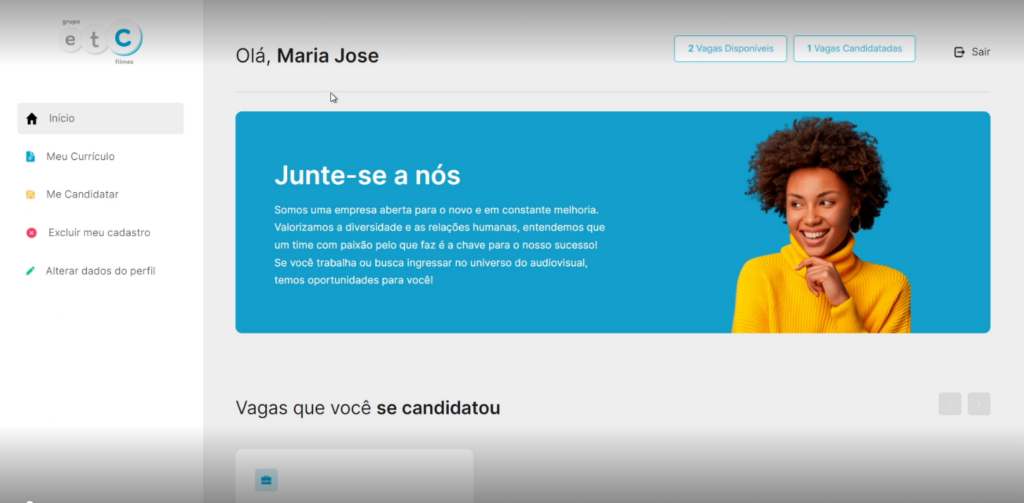 Vamos nos passar por um candidato onde irá se inscrever em uma vaga que exige que ele responda o questionário, após o candidato se logar, vamos para a página principal do candidato, como mostra a imagem abaixo: