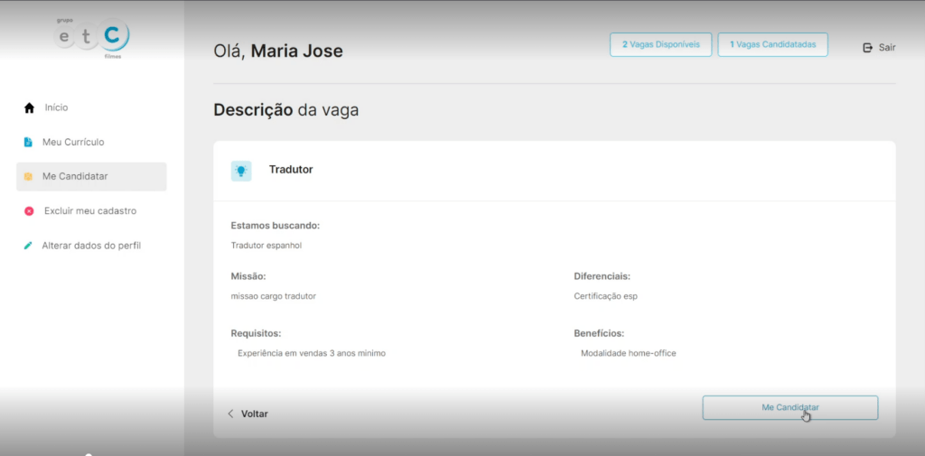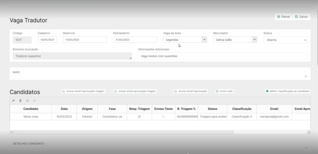 No Gerenciamento da vaga Tradutor, podemos ver o candidato que se candidatou para vaga e algumas de suas informações, como mostra a imagem abaixo: