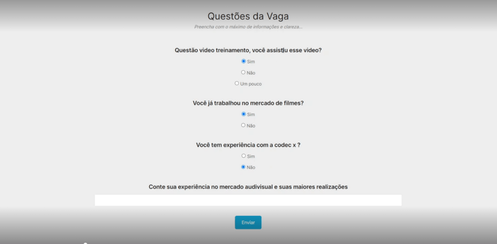 Após ir em Me candidatar irá abrir o questionário simples que não desqualifica o candidato, como mostra a imagem abaixo:
