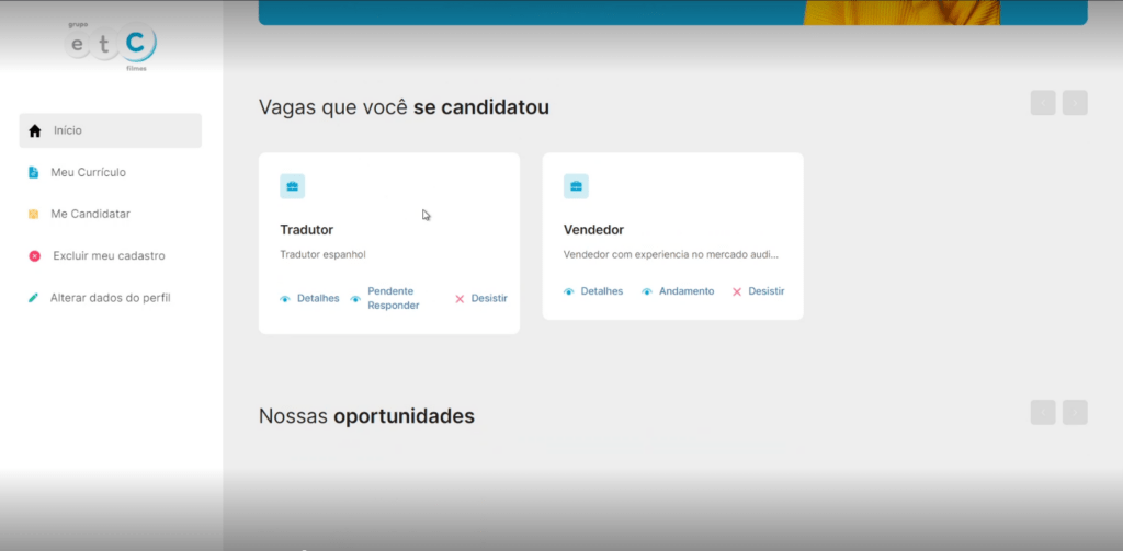 Mas abaixo vemos “Vagas que você se candidatou” onde fizemos um exemplo de vagas sem questionário e mais abaixo temos “Nossas Oportunidades” onde vamos dar o exemplo de uma vaga com questionário, vamos clicar em Detalhes para podermos ir para a página da vaga, como mostra a imagem abaixo: