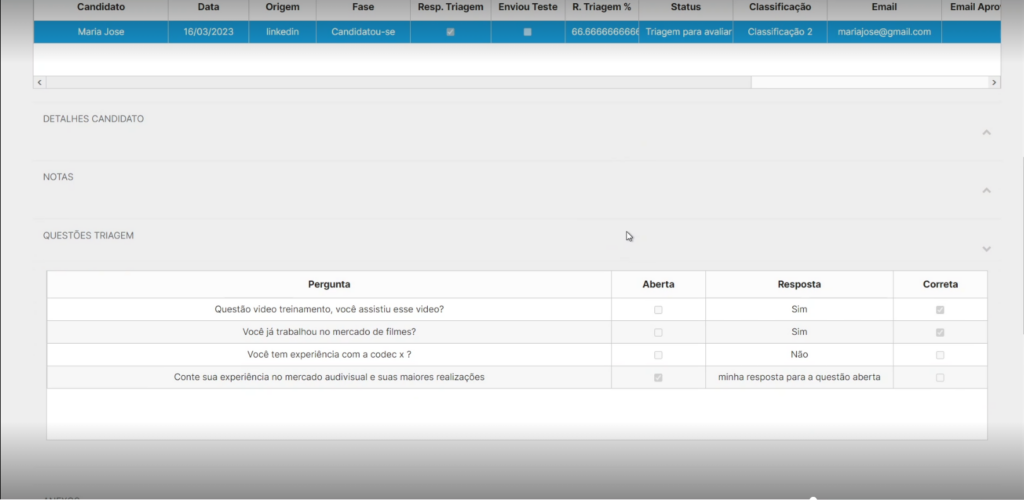 Podemos ver suas informações gerais, quando se candidatou, a fase que está, mostra o Resp.Triagem que seria que ele respondeu a triagem, temos o R.Triagem % que é a porcentagem de acerto do questionário e o Status que fica como Triagem para avaliar que quer dizer que só está aguardando a avaliação para passar para próxima fase.
