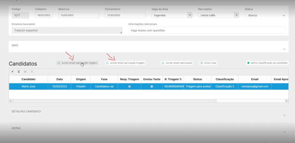 Então do Gerenciar mesmo, podemos visualizar o que o candidato respondeu e fazer uma avaliação baseado nessa análise dizendo se ele vai prosseguir na vaga ou não, podendo assim mandar um email de reprovação ou aprovação da triagem, em “enviar email reprovação triagem” e “enviar email aprovação triagem”, como mostra a imagem abaixo: