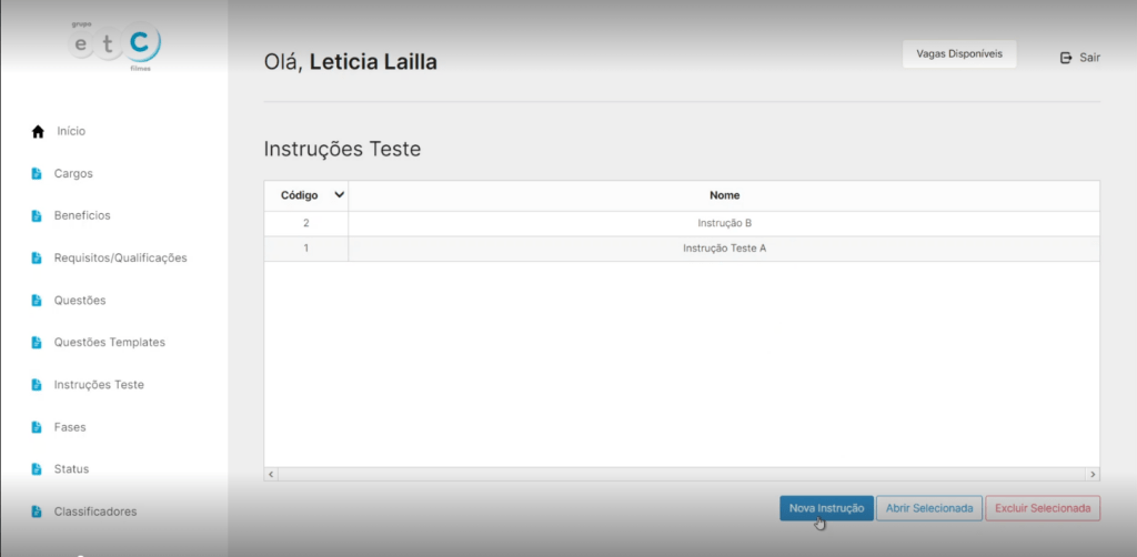 OBS: Como nesse exemplo respondemos o questionário correto, o candidato irá ser enviado para a Instrução Teste.