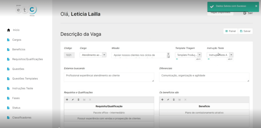 Podemos notar que já temos um Template Triagem que seria o questionário vinculado a vaga.