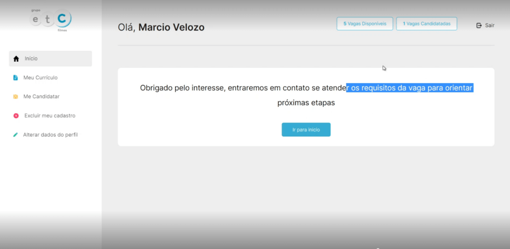 Após esse processo retornando a Página Inicial podemos notar que o status da vaga mudou para Aguardando Teste tendo mais esse feedback, como mostra a imagem abaixo: